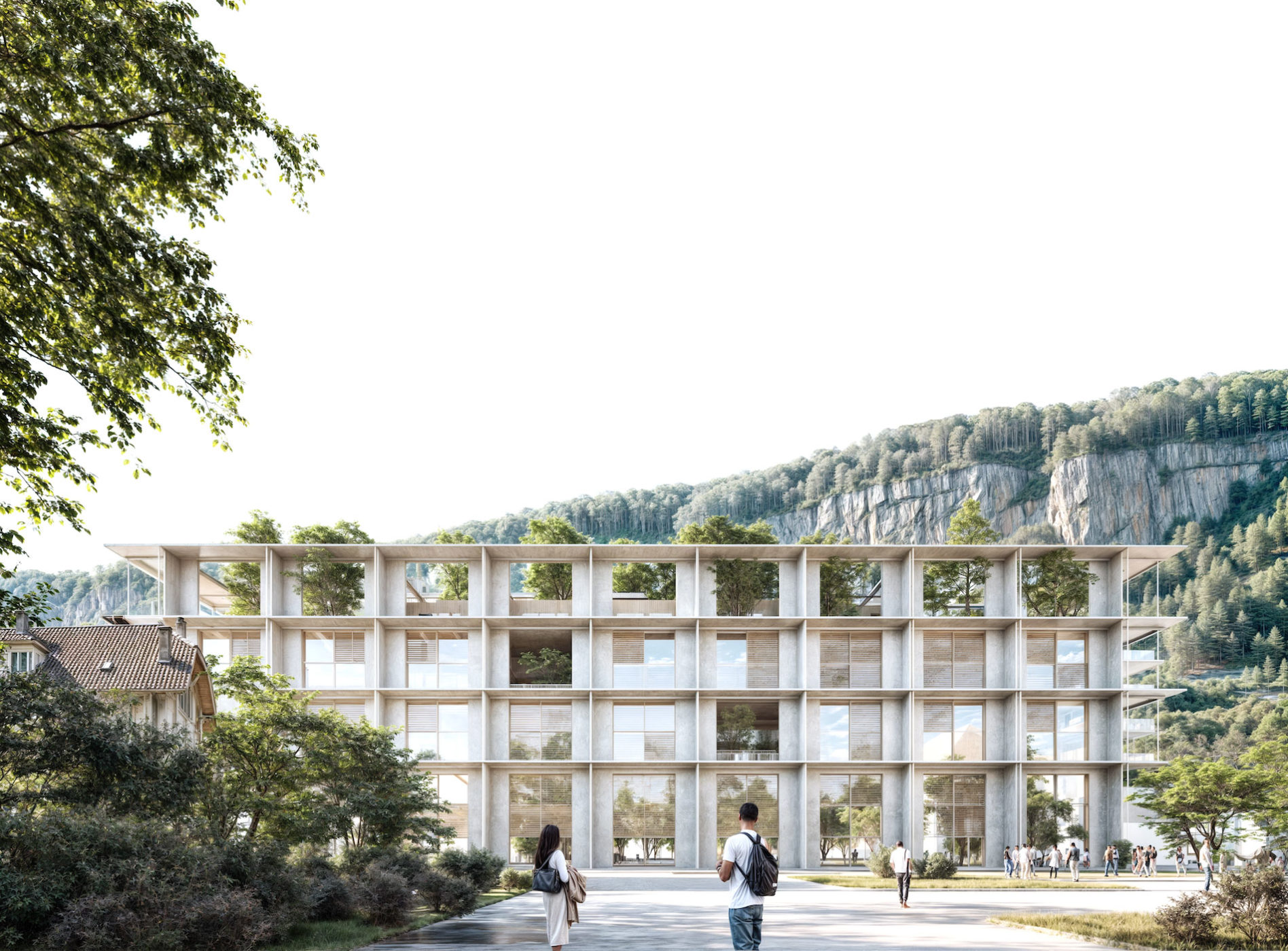La Haute école pédagogique du Valais, nichée au cœur de la Suisse, se dessine comme une grande structure poreuse, un espace où la lumière et l'air circulent librement, inspirant le savoir et la créativité. Imaginée comme un continuum, elle est traversée par un grand escalier serpentant depuis le sol jusqu'à la terrasse commune sur le toit, véritable jardin suspendu. Ce dernier offre une vue imprenable, où l'horizon se mêle aux cimes des montagnes et falaises calcaires environnantes, créant un lien puissant entre la nature et le lieu de formation. Ce dialogue, nous l’imaginons d’une part avec les échelles paysagères qui surplombent la ville, et d’autre part, avec les grands bâtiments historiques alentours (l’abbaye de Saint Maurice et la basilique, le château, l’internat du collège, etc…) Ce lien avec les grands monuments de Saint-Maurice, de même échelle, est subtil mais présent. Le nouveau projet ne cherche pas à dominer, mais à coexister en harmonie, célébrant le riche patrimoine tout en affirmant une vision contemporaine. Chaque matériau, comme le béton de site de la structure, chaque ligne architecturale, raconte une histoire de respect pour le passé et d'aspiration pour l’avenir... Le bâtiment, en s’inscrivant dans l’échelle de ces marqueurs de la ville, devient lui aussi un équipement symbolique et structurant de la ville. L'architecture du bâtiment affirme une structure en grille et permet une grande transparence depuis la ville vers les falaises. L'HEP met en scène sur ses façades Est et Ouest, de grandes baies protégées qui offrent depuis la ville, un regard sur la formation, l'innovation et l'expérimentation. Nous avons pensé les espaces de formation et d'échanges, adaptés à la philosophie et à l'ambition de ce type de programme inclusif et ouvert. L’aisance apportée en termes de surface notamment en RDC, conjuguée à la mutualisation de certaines parties du programme, permettent d’offrir aux utilisateurs un véritable lieu de vie, suffisamment flexible dans son utilisation pour susciter la créativité, le goût de l’apprentissage et de l’échange. Un laboratoire de diffusion du savoir et de la pédagogie qui permette aussi d’organiser des manifestations culturelles, pédagogique ou ludiques à l’échelle de la ville de Saint Maurice et du territoire du Valais.