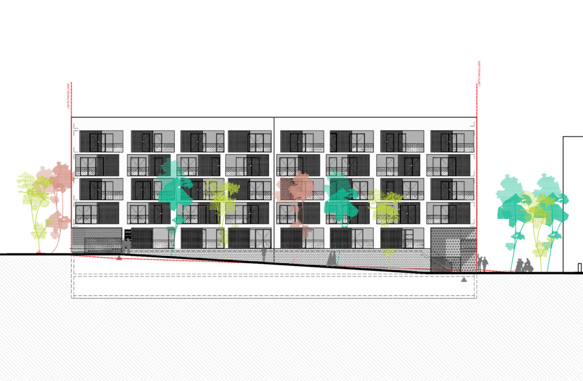 L’ensemble se compose d’un bâtiment principal en R+4 sur l’avenue au Sud, prolongé de deux ailes en R+2 qui dessinent une figure en U ouverte vers la colline Mirabilis. Dans son creux, le bâti accueille un jardin partagé par l’ensemble des habitants ; lieu de pose, d’échange, les courbes des tracés contrastent avec l’architecture du projet. Cette géométrie maîtrisée, associée à une épaisseur bâtie mesurée, permet l’organisation de logements traversants, baignés de lumière, offrant deux à trois orientations et une véritable respiration intérieure.